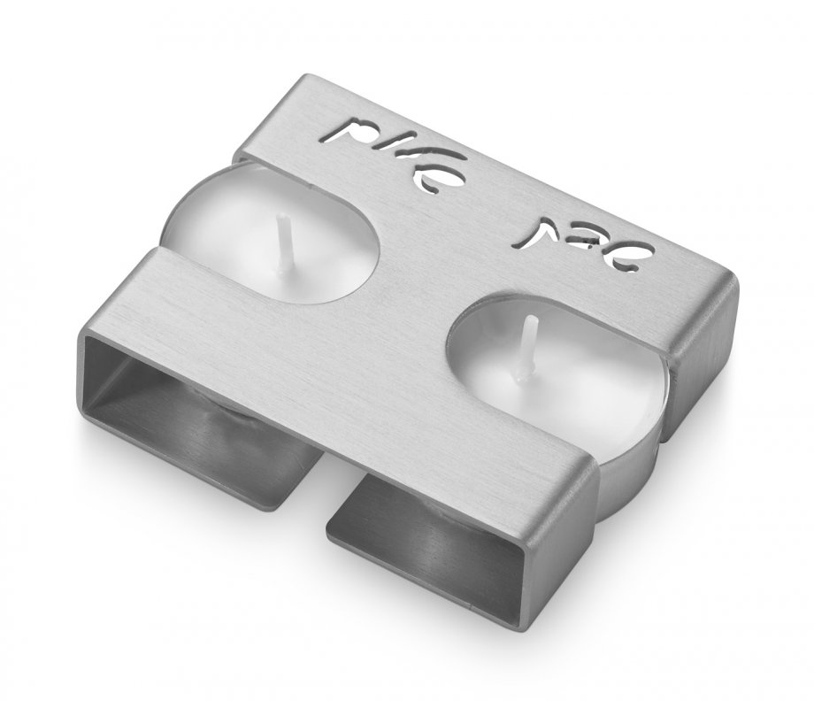 Great if you are looking for space-saving Shabbat candle holders for travelling or for the home. Made of brushed aluminum in an impressive silver color, it displays the Adi Sidler hallmark minimalist design. At the top is a striking cutout Shabbat Shalom. Made in Israel by Adi Sidler.