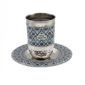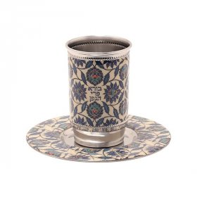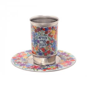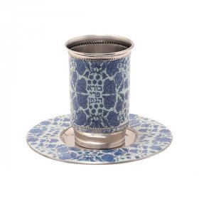 You will find classic Kiddush cups standing on matching plates. Michal Ben Yosef’s gleaming handmade ceramic Kiddush cup, offered in a choice of colors, is a feast for the eyes. Renowned Yair Emanuel displays hand-painted wood cups or an exclusive hammered aluminum cup with accompanying dish. An innovative touch is provided by a crystal glass cup and plate. Shraga Landesman offers an intriguing set - candles holders and Kiddush cup. For superior quality anodized aluminum and 3D engraving, you will love the Benny Dabah Kiddush cup. If you are looking for a unique exclusive Kiddush cup, you will be awestruck with the sleek geometric designs and stunning contemporary colors of the Avner Agayof cups.